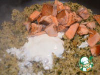 В рис вмешиваем петрушку (если есть зеленый лук- 1ст. л.), йогурт и аккуратно добавляем форель (чтобы не разваливались наши кусочки). Подержать еще пару минуток на огне |