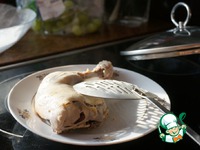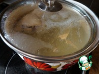 Из расчета на 3х-литровую кастрюлю. Варим бульон из нашей курочки. У меня окорок, но можно и из костей сварить. |