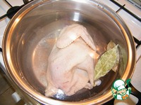 Отварить курицу до готовности для бульона. Достать курицу из бульона. |
