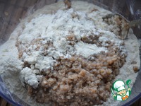 Всыпать муку. Замесить мягкое тесто, которое слегка "пристает" к рукам. Тесто выложить в смазанную маслом миску и поставить в тёплое место. Дать тесту подняться в два раза. |