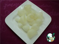 Сольем кипяток, обдадим холодной водой и разделим лук на чашечки. Оставим наиболее крупные и красивые, остальные мелко порежем. |
