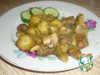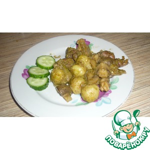Когда капуста будет готова добавляем ее и шампиньоны к сердечкам. На этом этапе можно еще добавить специй или посолить. При необходимости добавить воды. |
