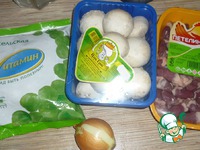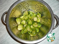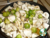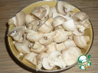 Если шампиньоны свежие, то моем и срезаем край ножки. Разрезаем на 2-4 части. Капуста и шампиньоны должны быть приблизительно одного размера с сердечками (лучше смотрится). |