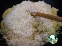 Как только халва будет готова, убрать ее с огня и добавить кокосовую стружку. Хорошо перемешать. |