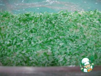 Форму застелить пищевой пленкой, уложить белую часть халвы, посыпать зеленой кокосовой стружкой. |