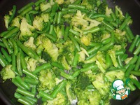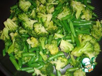 Брокколи разобрать на небольшие соцветия. Выложить вместе со стручковой фасолью в сковороду и подлить немного воды (если овощи размороженные, то в них достаточно жидкости и воду можно не добавлять). |