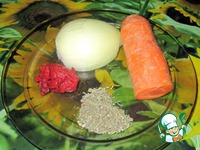 Лук порезать и обжарить на оливковом масле, добавить тертую морковь, томатную пасту, соль, перец, тушить до готовности |
