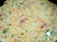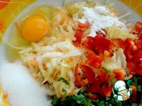 Растопите масло. Смешайте в миске капусту с яйцами (добавила 1, у меня очень большое было), масло, сахар, зелень - мелко порезать, кубиками перец. |