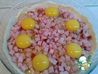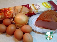 Состав продуктов: 6 яиц, большая луковица, ветчина - 200гр, тесто 500-600гр. |