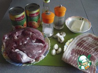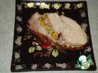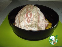 С одной стороны мясо надрезаем, чтобы получился карман. Закладываем туда нашу начинку. Сверху выкладываем бекон, полностью закрывая мясо. |