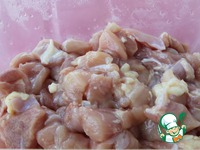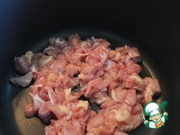 В большой кастрюле на среднем огне обжариваем мясо курицы на оливковом масле в течение 6-7 минут. |