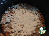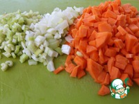 Добавить мелко нарезанный лук, морковь и сельдерей и тушить их в течение 5 - 7 минут. |