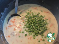 Теперь вливаем сливки и горох. Все приправить солью и перцем по вкусу. Тушим на медленном огне еще около 10 минут. В это время разогреваем духовку до 180 С. |