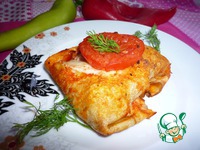 Тонко режем сыр, кладем ломтик на конверт, затем - кружочек помидорки. |
