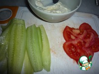 Очищаем от кожуры огурец, тонко нарезаем. Помидор нарезаем тоже тонко, кружочками. Майонез смешиваем, с выдавленным через пресс, чесноком. |