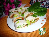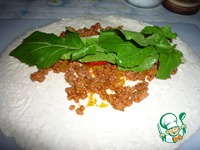 Добавляем пару листочков салата и рукколы. Аккуратно сворачиваем рулет. |