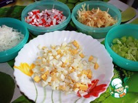 Крабовые полочки и яйцо нарезаем кубиками. Сельдерей тоненько шинкуем. Дайкон и яблоко трем на крупную терку. |