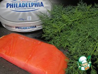 Подкопченый лосось порезать на тоненькие пластины. Укроп мелко порезать. Немного укропа добавить в сыр Филадельфия, перемешать. |