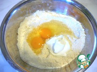 Добавляем сметану и яйца, еще раз вымешиваем. |