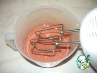 Пока он остывает яичные белки взбиваем миксером на большой скорости, постепенно добавляя сахар, сок лимона и 2 стол. л. клубничного пюре. |