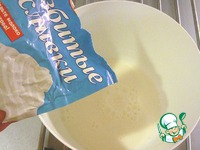 Взбиваем 150 мл. холодного молока и содержимое пакетика "взбитые сливки". Предпочитаю натуральные сливки, но купить не успела, да и времени бежать в магазин, уже не было. |