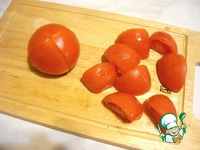 Помидоры надрезаем крест-накрест, ошпариваем кипятком, снимаем кожицу и нарезаем на 4-6 частей. |
