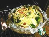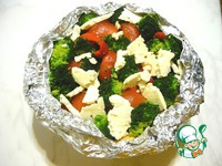 Сверху кладем перец, помидоры, брокколи, подсаливаем овощи. Между овощами раскладываем небольшие кусочки адыгейского сыра. Солим по вкусу, посыпаем тертым сыром, я использовала "российский". |