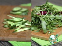 Итак, приступим... Огурец нарезать соломкой, рукколу помыть. |