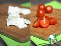 Моцареллу нарезать небольшими кусочками, помидоры разрезать пополам. |