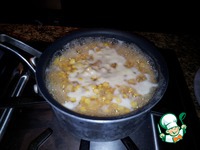 Горох варим не помешивая! Я варю на среднем огне, где-то 10-15 мин или пока вода выпарится. Горох не должен быть мягким. |