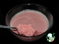 Желатин замочить в небольшом количестве холодной воды на 10 минут. Затем довести до кипения (но не кипятить) на небольшом огне, остудить, и влить в клубничное пюре. |
