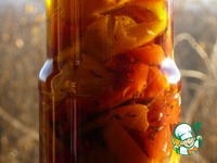 Перцы помыть, обсушить, вырезать семена и разрезать на длинные сегменты. Выложить на плоское блюдо и поставить на самую большую мощность. Время точное не скажу, нужно постоянно следить и иногда переворачивать. Самую первую порцию я сожгла дочерна, включила и ушла (поэтому предупреждаю). Готовые вяленые перцы слегка присыпать солью и уложить плотно в банку, пересыпая слои нарезанным чесноком, душистым горошком и травами. Наполненную банку залить оливковым маслом до самого горлышка, закрыть крышкой и дать настояться перцу несколько дней. Потом можете открывать и наслаждаться. К тому же, полученное ароматное масло можно использовать в разных блюдах, например, заправлять им салаты.