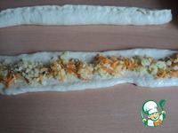 Разделываем тесто: делим на 3 полоски. Каждую раскатываем, на середину укладываем начинку, защипываем. |