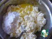 В протертый через сито творог добавить сахарную пудру, муку, желтки трех яиц. |