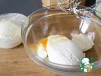 Взбить сливки с ванильным сахаром. Смешать в миске оба вида сыра, добавить мед (по желанию добавить ложку коньяка или рома), взбить. |
