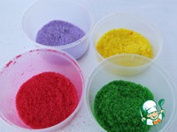 Разноцветный сахар приготовить легко, насыпаем сахар в пластиковый контейнер добавляем каплю красителя накрываем крышкой и хорошо встряхиваем минутку. |