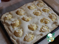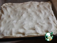Наше тесто подошло уже.. делим его на 2 части, раскатываем одну в пласт примерно 38на32.. берем лист, застилаем его бумагой и кладем наш пласт... на него выкладываем нашу начинку из яблок... |