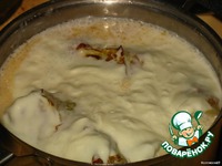 Складываем в кастрюльку, заливаем пакетом 10% сметаны, солим, можно добавить с полстакана водички. |