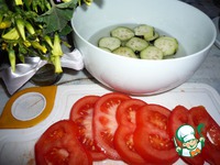 Порезать баклажан и помидор кружочками. Баклажан положить на 20 минут в подсоленную воду. |