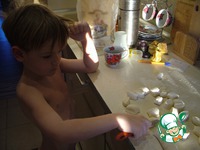 Голенький Максимка проспал скатывание колбасок, но нарезку он не упустит (хотя глаза еще полузакрыты, но руки чётко по мышечной памяти делают свое дело). |