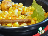 Добавить горох и нут, палочку корицы и вяленый лимон. Перемешать. |