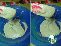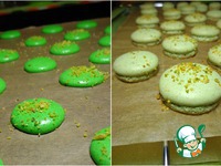 Скажу вам по секрету, я разделила на 2 части все ингредиенты, т. к. в очередной раз проводила испытания новой бумаги для выпечки и не совсем была уверена в дозировке красителя ( использовала сухой). Так что половина макарошек у меня получились интеллигентно-фисташ кового цвета, а другая половина... феерично - зелёного)