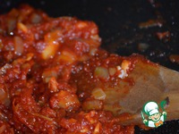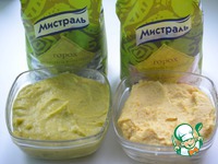 В посуду выложить пюре из зеленого гороха, затем мелко нарезанные или целые морепродукты, пюре из желтого горошка, томатная паста. |