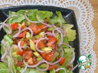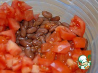 А можно на порционные тарелки выложить листья салата, затем смесь фасоли, помидоров и авокадо и сверху украсить маринованным луком. |