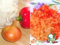Лук, перец и капусту пропустить через мясорубку, отжать и слить жидкость с овощного фарша. |