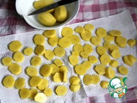 Картофель очистить, помыть, нарезать кружочками и выложить на салфетки и промокнуть сверху, чтобы убрать лишнюю влагу. |