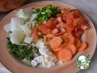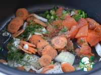 В мультиварку наливаем пару ложек ароматного масла, закидываем и слегка обжариваем овощи (около 10 минут - режим выпечка) |