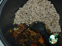 К получившейся смеси добавляем перловку, минут 10 даем потомиться |
