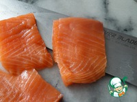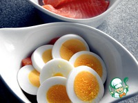 Рыбу нарезать на кусочки толщиной 0,5 см. Сбрызнуть слегка лимонным соком. Яйца варенные нарезать кружочками. Если вам нравится по пикантнее, то вы можете использовать не свежую а копченную рыбу. |