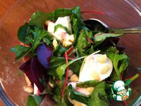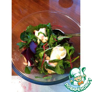 Половину салата из пакета кладем в миску. Свеклу и сыр нарезаем ломтиками, орехи рубим. |